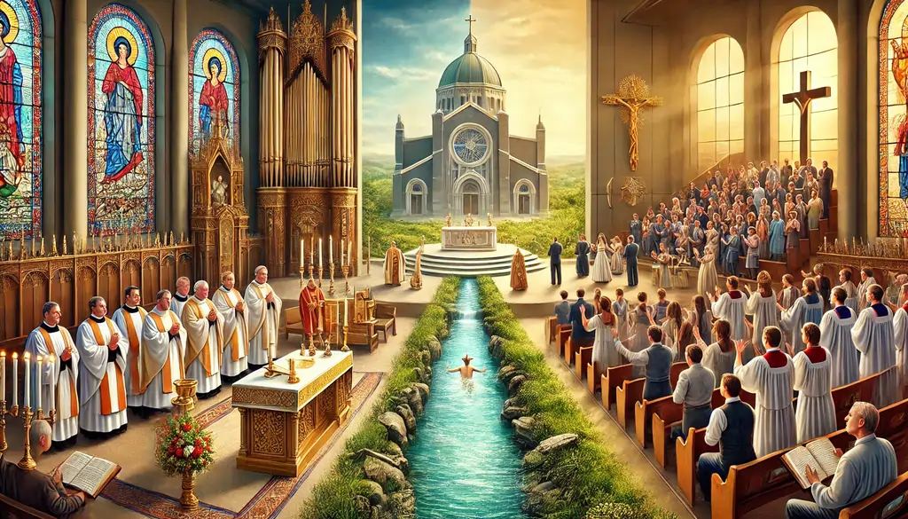| Mass/Worship | Highly liturgical, Eucharist-centered, same order globally | More spontaneous, Word-centered, varies by congregation |